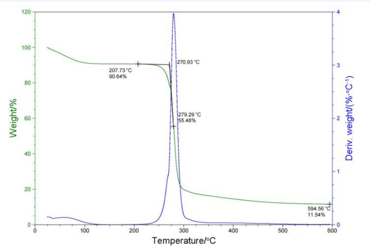 我們分別使用差示掃描量熱儀(DSC)和熱重分析法(TGA)測定C72-MPB氟磷酸膽堿熱量和重量相關(guān)量隨溫度升高的變化(圖7和圖8)。