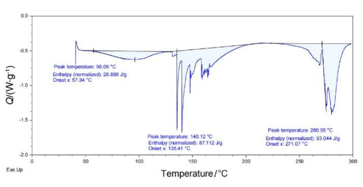 TGA圖中可以看到樣品的失重主要集中在100℃以下和250℃到300℃,DSC圖中可以看出樣品的吸熱主要有三個(gè)區(qū)域,分別在100℃以下,140——170℃和260——300℃。結(jié)合TGA和DCS來看,在溫度100℃以下部分是少量溶劑及產(chǎn)物中的水蒸發(fā),溫度達(dá)到140℃時(shí),DSC中有吸熱峰,但TGA曲線沒有變化,說明產(chǎn)物發(fā)生相變,從固體轉(zhuǎn)變?yōu)橐后w,直到250℃左右開始失重,最終仍有11.54%固體剩余證明一定存在分解現(xiàn)象并產(chǎn)生固體產(chǎn)物,結(jié)合DSC圖中有多個(gè)吸熱峰來看推測是產(chǎn)物有多步分解,也不排除存在部分的汽化失重的可能性。