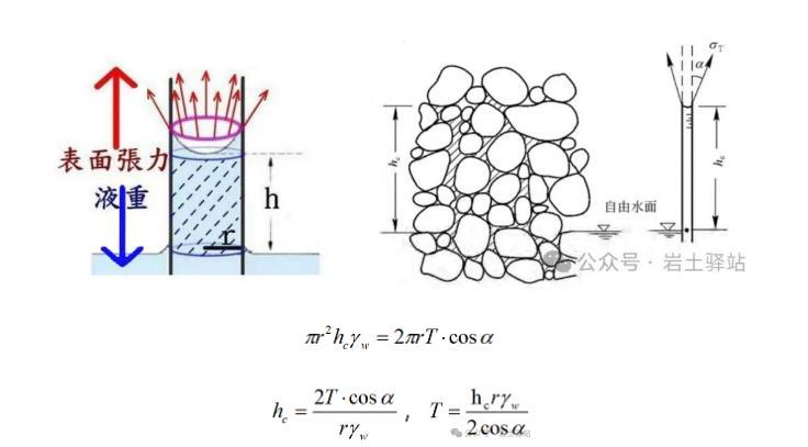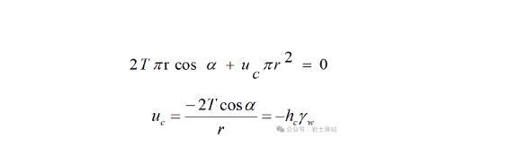 來自《土力學》式中,水膜張力T與溫度有關,單位:N/cm或KN/m;10°時,T=7.41×10-4N/cm=7.41×10-5KN/m;方向與毛細管成夾角α,該角度的大小與土顆粒礦物成分和水性質(zhì)有關;