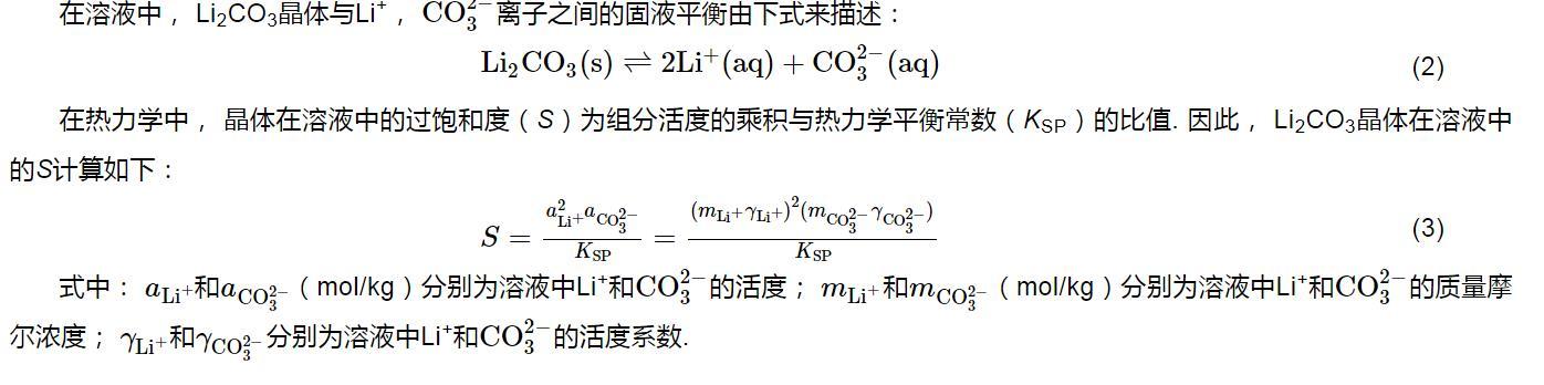 在熱力學中,晶體在溶液中的過飽和度(S)為組分活度的乘積與熱力學平衡常數(shù)(KSP)的比值.因此,Li2CO3晶體在溶液中的S計算如下: