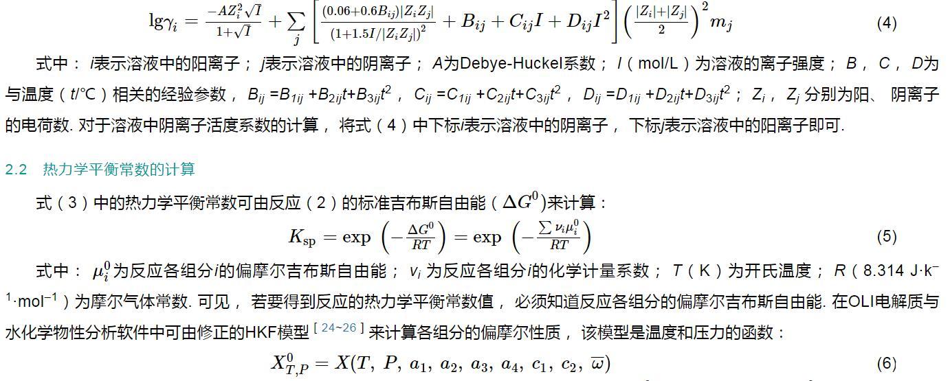 因此,式(3)中離子的活度系數(shù)可由OLI電解質與水化學物性分析軟件[20]內嵌的Bromley-Zemaitis方程[22,23]來計算: