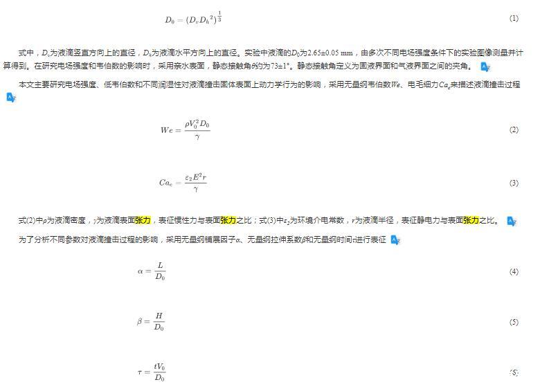 本文主要研究電場(chǎng)強(qiáng)度、低韋伯?dāng)?shù)和不同潤(rùn)濕性對(duì)液滴撞擊固體表面上動(dòng)力學(xué)行為的影響,采用無(wú)量綱韋伯?dāng)?shù)We、電毛細(xì)力Cae來(lái)描述液滴撞擊過程