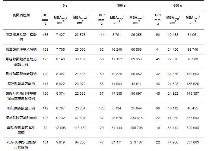 表面活性劑的泡沫形態(tài)數(shù)據(jù)如表3所示,包括10種表面活性劑溶液在產(chǎn)生最大泡沫體積之后的0,300和600 s時(shí)的泡沫密度(BC)、平均氣泡面積(MBAavg)和最大氣泡面積(MBAmax);同時(shí),選取了5種具有代表性的表面活性劑,對(duì)其泡沫形態(tài)進(jìn)行拍照觀察,如圖3所示。最初,所有陰離子表面活性劑的氣泡都非常小且均勻,其中椰油酰谷氨酸二鈉、椰油酰氨基丙酸鈉和甲基椰油酰基?;撬徕c這3種氨基酸表面活性劑的平均氣泡面積分別為6 787,6 822和7 427μm2;而兩性和非離子表面活性劑的平均氣泡面積較大,其中椰油酰胺丙基甜菜堿為9 732μm2、辛酰/癸酰氨丙基甜菜堿為12 698μm2、PEG-80失水山梨醇月桂酸酯為9 619μm2。在600 s時(shí),大多數(shù)陰離子表面活性劑氣泡的平均面積在30 000μm2以內(nèi),椰油酰兩性基乙酸鈉的平均氣泡面積為24 426μm2,其余兩性和非離子表面活性劑的平均氣泡面積均大于40 000μm2,其中辛酰/癸酰氨丙基甜菜堿達(dá)到53 442μm2。以上結(jié)果表明,甲基椰油?;;撬徕c、椰油酰谷氨酸二鈉具有較好的泡沫形態(tài)穩(wěn)定性,600 s后其泡沫密度和氣泡面積變化相對(duì)較小,而椰油酰胺丙基甜菜堿、辛酰/癸酰氨丙基甜菜堿、PEG-80失水山梨醇月桂酸酯的泡沫密度和氣泡面積變化相對(duì)較大,其泡沫形態(tài)穩(wěn)定性較差。