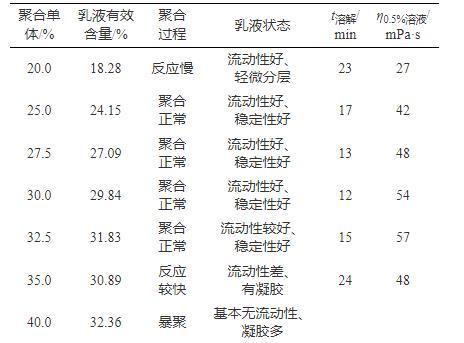 乳液中聚合物有效含量越高,增黏能力越強(qiáng),使用成本越低,聚合單體濃度直接決定乳液有效含量,并通過(guò)影響聚合反應(yīng)過(guò)程進(jìn)而影響減阻劑綜合性能。