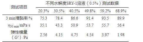 數(shù)據(jù)顯示,隨水解度增大,SRY-1增黏率和表觀黏度都顯著提高,但水解度超過(guò)60%后,增黏率又有所降低,SRY-1溶液G'呈現(xiàn)先增大后減小的趨勢(shì)。分析認(rèn)為:在一定范圍內(nèi),由于水解度增大,分子鏈更加伸展,分子間共價(jià)鍵作用更易形成彈性微觀網(wǎng)絡(luò)結(jié)構(gòu),彈性模量G'增大;隨著水解度繼續(xù)增大,聚合物分子流體力學(xué)體積持續(xù)增大而很難交叉纏繞,黏性行為明顯,彈性減弱,表現(xiàn)為彈性模量G'減小。因此水解度過(guò)度提高會(huì)造成增黏率下降,溶液黏性增強(qiáng),彈性降低的負(fù)面影響。由數(shù)據(jù)可知,SRY-1水解度為40%~50%時(shí),SRY-1的3 min增黏率可達(dá)90%以上,溶液黏彈性最為顯著。