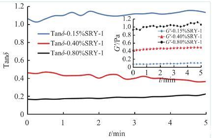 黏彈性是指流體對施加外力的響應(yīng),表現(xiàn)為黏性和彈性雙重特性,通常用G′表征彈性模量,G″表征黏性模量,而G″與G′的比值記作Tanδ,用于表征流體黏彈性的強(qiáng)弱:隨Tanδ由大到小變化,流體黏彈特性越明顯,Tanδ>1時,流體流動性強(qiáng),Tanδ<1時,流體結(jié)構(gòu)性強(qiáng)。對0.15%、0.4%、0.8%SRY-1的壓裂液進(jìn)行了黏彈性測試(利用RS6000流變儀錐板測試系統(tǒng)進(jìn)行定頻率定應(yīng)力掃描實驗,測試得到的彈性模量G′、Tanδ變化情況見圖6所示。