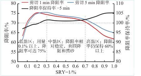 壓裂液降阻率的變化階段分別對應(yīng)了壓裂液的低黏、中黏和高黏,充分了解這一變化規(guī)律,可以合理進(jìn)行變黏控制以滿足壓裂施工不同階段(造縫階段、成網(wǎng)階段、支撐階段)對壓裂液降阻性能的特殊要求;同時,測試過程中還發(fā)現(xiàn),低黏液(0.2%以內(nèi))的降阻率保持率在96%以上,而中黏液、高黏液經(jīng)過5 min循環(huán)剪切后降阻率保持率超過100%,與本體系的結(jié)構(gòu)流體特性(剪切稀釋性、觸變性)密切相關(guān),這一特性也消除了深井大排量壓裂面臨的壓裂液降阻性能降低或失效的風(fēng)險。