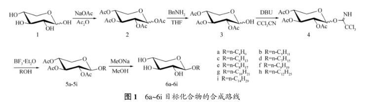 采用全乙?;哪咎?2)在四氯化錫催化下與一系列脂肪醇發(fā)生偶聯(lián)反應(yīng),對(duì)時(shí)間要嚴(yán)格控制,否則有部分轉(zhuǎn)化成α-異構(gòu)體,當(dāng)時(shí)間過長(zhǎng)時(shí),還會(huì)形成以α-糖苷為主的產(chǎn)物和少量2-位脫保護(hù)的糖苷副產(chǎn)物。參考烷基-β-D-葡萄糖苷等合成與性能研究成果,按照Scheme1所示的路線,以D-木糖(1)為原料通過乙?;⒚?-位乙?;?、與三氯乙腈反應(yīng),得到相應(yīng)的三氯乙酰亞胺酯(4)。采用易于構(gòu)筑1,2-反式糖苷鍵的三氯乙酰亞胺酯法,以三氟化硼乙醚作糖苷化偶聯(lián)反應(yīng)的催化劑,使得具有鄰基參與效應(yīng)的三氯乙酰亞胺酯(4)與相應(yīng)的脂肪醇反應(yīng)及相應(yīng)的脫乙?;Wo(hù),合成一系列烷基-β-D-吡喃木糖苷,如圖1所示。本文作者對(duì)其溶解性、表面張力、乳化性能、液晶性能、熱穩(wěn)定性等理化性質(zhì)進(jìn)行研究。