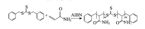 在500 mL四口燒瓶中加入200 g無水乙醇、10 g(0.14 mol)AM和一定量DBTTC〔其中,n(AM)∶n(DBTTC)=100∶1、200∶1、300∶1、500∶1、700∶1、1000∶1〕,超聲混合均勻后再加入0.0231 g(0.14 mmol)AIBN,然后在70℃下反應8 h。反應結束后,趁熱出料,過濾。在超聲條件下,用正己烷洗滌沉淀,過濾,重復數(shù)次,除去未反應完全的反應物,在45℃下真空干燥24 h,得到淡黃色的PAM-CTA固體粉末。將上述不同n(AM)∶n(DBTTC)制得的產(chǎn)物依次命名為PAM-CTA-1、PAM-CTA-2、PAM-CTA-3、PAM-CTA-4、PAM-CTA-5、PAM-CTA-6。