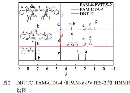 圖2為DBTTC、PAM-CTA-4和PAM-b-PVTES-2的1HNMR譜圖。如圖2所示,DBTTC的1HNMR譜圖曲線中δ=1.92(a)為氘代丙酮的質子峰,δ=7.13~7.31(b)是苯環(huán)上的質子峰;δ=4.56(c)的峰為亞甲基(—CH2—)的質子峰;δ=2.62(i)為DBTTC樣品中含有的極少量H2O的質子峰,可以確定成功合成了RAFT試劑DBTTC。PAM-CTA-4和PAM-b-PVTES-2的1HNMR譜圖曲線中,δ=4.80(j)為重水(D2O)的質子峰;δ=7.27~7.48(b)是苯環(huán)上的質子峰;δ=4.82(d)為酰胺基(—NH2)的質子峰;δ=1.95~2.24(e)是主鏈上的次甲基(—CH—)的質子峰;δ=1.31~1.66(f)是主鏈上的亞甲基(—CH2—)的質子峰。在PAM-CTA-4曲線中,δ=3.78~3.82(c)為與苯環(huán)相連亞甲基的質子峰。PAM-b-PVTES-2曲線中δ=3.39~3.43(c+h)為與苯環(huán)相連和乙烯基中的亞甲基(—CH2—)質子峰;δ=0.93~0.95(g)為有機硅中甲基(—CH3)的質子峰。通過FTIR譜圖和1HNMR譜圖可以確定合成了PAM-CTA-4和PAM-b-PVTES-2。