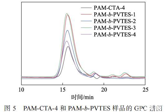 圖5為不同n(VTES)∶n(AM)合成的PAM-b?PVTES樣品的GPC譜圖,結(jié)果列于表2。PAM-b?PVTES樣品的相對(duì)分子質(zhì)量分布相較于PAM-CTA-4的相對(duì)分子質(zhì)量分布變大,且隨著VTES用量的增加,聚合物鏈段增長,PAM-b-PVTES的Mw從9058增加到10707。