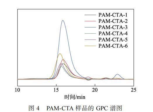 從表1可知,隨著DBTTC用量的降低,共聚物相對(duì)分子質(zhì)量逐漸增加,重均相對(duì)分子質(zhì)量(Mw)由5755增加到10505。這是因?yàn)?,隨著鏈轉(zhuǎn)移劑DBTTC用量的增加,反應(yīng)體系中DBTTC的濃度增加,鏈增長自由基與鏈轉(zhuǎn)移劑DBTTC反應(yīng)生成休眠中間體,鏈增長停止,PAM-CTA的相對(duì)分子質(zhì)量隨著鏈轉(zhuǎn)移劑用量的增加而降低,實(shí)現(xiàn)對(duì)PAM-CTA相對(duì)分子質(zhì)量的可控合成。由于PAM-CTA-4的分子量分布最窄,因此,選擇PAM-CTA-4進(jìn)行下一步反應(yīng)。