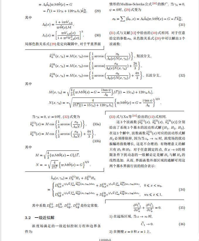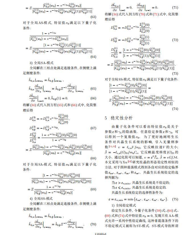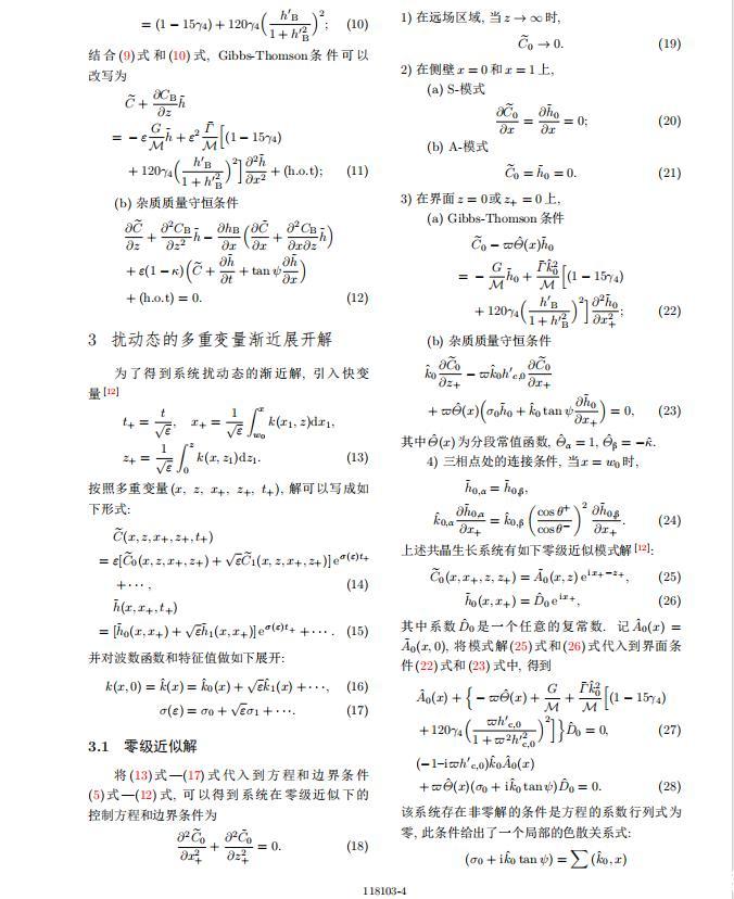 將系統(tǒng)方程以振幅遠(yuǎn)小于1進(jìn)行線性化處理,結(jié)合(1)式—(4)式,可以得到共晶生長(zhǎng)系統(tǒng)的擾動(dòng)態(tài)滿(mǎn)足以下控制方程和邊界條件: