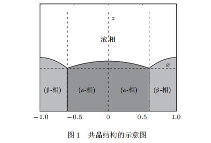 假設(shè)由α和β兩相組成的片層共晶以拉度V向液相穩(wěn)定推進(jìn),共晶片層與固-液界面垂直.選取固-液界面處α相片層的中心為坐標(biāo)原點(diǎn),x軸與片層垂直,z軸與晶體生長(zhǎng)方向平行,如圖1所示.共晶界面用函數(shù)z=h(x,t)表示,它也是共晶生長(zhǎng)解的一部分.