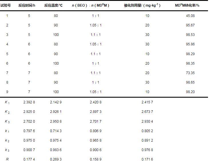 (1)以三氯化釕為催化劑,BEO和MDHM為原料,成功合成了目標(biāo)產(chǎn)物BEOTSS;采用正交試驗優(yōu)化了催化反應(yīng)條件:催化劑用量30 mg/kg,n(BEO)∶n(MDHM)為1.05∶1,反應(yīng)時間6.0 h,反應(yīng)溫度100℃,在此工藝條件下MDHM轉(zhuǎn)化率可達(dá)99%。