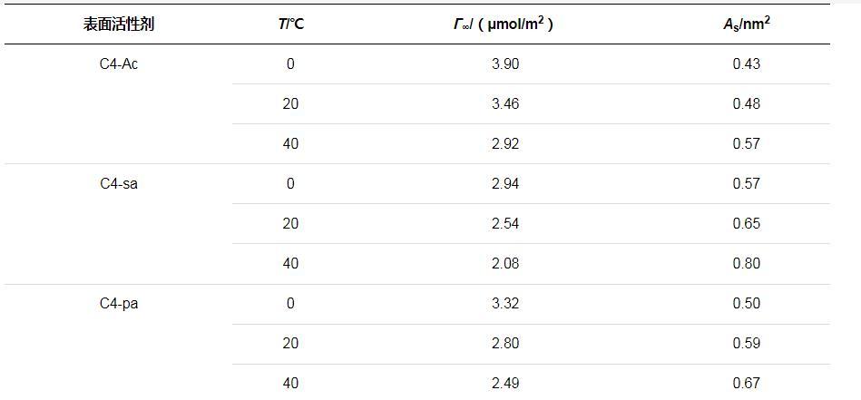 通常較高的?!藓洼^低的AS值表明表面活性劑分子密集地排列在空氣與水的界面上,由上述公式計(jì)算得到三種表面活性劑的?!藓洼^低的AS值如表2所示。對(duì)比參數(shù)可知,同種表面活性劑的Γ∞均隨溫度的升高而減小,AS有所增大,吸附表面的分子排布較為松散。這是由于溫度較高的情況下表面活性劑分子熱運(yùn)動(dòng)加劇,更易從吸附界面上脫離,并且因無規(guī)則運(yùn)動(dòng)導(dǎo)致吸附分子所占面積增大了。溫度升高導(dǎo)致溶解度的增加,因而表面的?!迺?huì)有所減小。由于?!捱€受到表面張力隨濃度變化曲線斜率的影響,因此所得趨勢(shì)是綜合影響的結(jié)果。此外,由表中還可以看出,C4-sa分子的?!拮钚。珹S最大,在溶液表面的排列更加松散。這可能是由于親水端磺酸基團(tuán)之間強(qiáng)靜電排斥力,并且空間位阻較大。