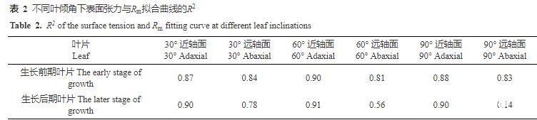 由表2結(jié)果可知,蘋果葉片生長前期近、遠(yuǎn)軸面和生長后期近軸面,不同葉傾角下表面張力與Rm值擬合曲線的R2均高于0.80。而蘋果葉片生長后期遠(yuǎn)軸面除30°時R2高于0.7外,其他葉傾角下均低于0.6,且隨著葉傾角增大,R2不斷減小,這表明蘋果葉片生長后期遠(yuǎn)軸面的表面張力與Rm值之間的線性關(guān)系較差。