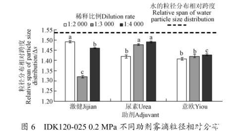 此試驗條件下自來水的粒徑相對分布跨度為1.544。3種助劑溶液霧滴粒徑相對分布跨度Δ受溶液配比因素影響程度不同。激健溶液1:3 000配比條件下對霧滴粒徑相對分布跨度影響最為顯著,為1.320,與水相比減小14.50%,明顯優(yōu)于該條件下其他各組數據。與尿素相比,意歐助劑在各濃度比例下對霧滴粒徑相對分布影響保持在降低8%左右,改善效果更優(yōu),且受濃度變化影響小。