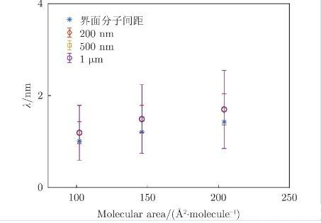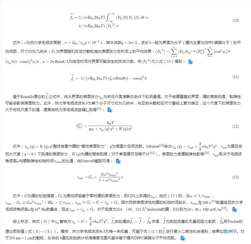 公式中,純水界面的表面張力為宏觀尺度準(zhǔn)靜態(tài)條件下的測(cè)量值。對(duì)于被膜覆蓋的界面,膜的彎曲剛度、黏彈性可能會(huì)影響表面張力。此外,熱力學(xué)毛細(xì)波波長為單個(gè)分子尺寸約為幾納米,與亞微米顆粒在尺寸量級(jí)上更為接近,這個(gè)尺度下的表面張力大于宏觀尺度下的值,通常由熱力學(xué)毛細(xì)波振幅測(cè)得: