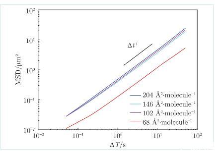 在LE相表面均勻的膜上,均方位移MSD隨時(shí)間間隔Δt線性增長(圖4),阻力系數(shù)由愛因斯坦關(guān)系