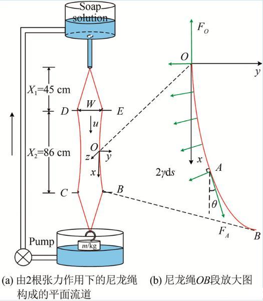 如圖1(a)所示,配制的皂液盛于上水箱中,經(jīng)一個(gè)狹長的出水管流出,進(jìn)入一個(gè)由兩根直徑為0.32 mm的尼龍繩構(gòu)成的豎直平面流道(實(shí)驗(yàn)中,尼龍繩一直處于下方砝碼施加的張力作用下)。緊接出水管口的流道為漸擴(kuò)的擴(kuò)張段,其下為流道寬度不變的實(shí)驗(yàn)段和流道逐漸收窄的收縮段(在本文實(shí)驗(yàn)中,擴(kuò)張段長度X1=45 cm;實(shí)驗(yàn)段長度X2=86 cm,實(shí)驗(yàn)段入口寬度W=5 cm)。在擴(kuò)張段,皂液在重力驅(qū)動下加速,當(dāng)重力和空氣阻力平衡時(shí)充分發(fā)展,最終在實(shí)驗(yàn)段達(dá)到勻速運(yùn)動,之后經(jīng)收縮段流入下水箱,再被泵回至上水箱,形成往復(fù)循環(huán)。