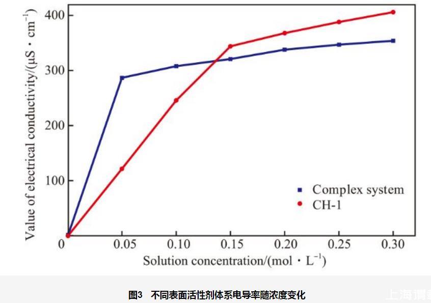 由圖3可看出,兩種表面活性劑的電導(dǎo)率均隨濃度的增加呈先迅速增大后緩慢增長的趨勢。這是因?yàn)楸砻婊钚詣舛鹊陀赾mc時(shí),表面活性劑主要以單體形式存在,單體中的離子可在溶液中自由移動,從而增加了溶液的導(dǎo)電能力;當(dāng)表面活性劑濃度高于cmc時(shí),一部分離子被包裹在膠束內(nèi)部,使得自由移動的離子數(shù)量增加幅度減小,遠(yuǎn)小于濃度低于cmc時(shí)電導(dǎo)率隨濃度增加的幅度。陽-非離子復(fù)合表面活性劑電導(dǎo)率轉(zhuǎn)折點(diǎn)時(shí)的濃度低于CH-1電導(dǎo)率轉(zhuǎn)折點(diǎn)時(shí)的濃度。這是因?yàn)閺?fù)配后,離子型表面活性劑的離子頭基與非離子表面活性劑的極性頭基之間可通過靜電引力、離子-偶極等作用相結(jié)合。這種相互作用增強(qiáng)了表面活性劑分子在界面上的吸附能力和在溶液中的聚集能力,使得形成膠束所需的濃度降低,即cmc減小。