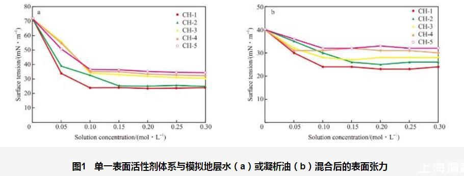 圖1單一表面活性劑體系與模擬地層水(a)或凝析油(b)混合后的表面張力