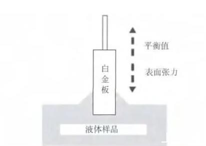 本試驗(yàn)表面張力值采用吊板法測量,如圖1所示:白金板因被測溶液的表面張力而將其向下拉,當(dāng)總表面張力與液體的重量平衡時(shí),通過測量白金板浸入待測溶液的深度,便可知溶液的表面張力值,其原理見式(1)。
