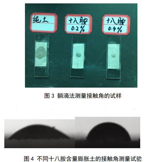 目前測(cè)量粉體接觸角(包括土顆粒)的方法主要有3種:躺滴法、毛細(xì)管上升法和Wilhelmy平板法,其中,躺滴法測(cè)出的接觸角為介于前進(jìn)接觸角和后退接觸角之間的表觀接觸角,毛細(xì)管上升法測(cè)出的接觸角為前進(jìn)接觸角,Wilhelmy平板法測(cè)出的接觸角為前進(jìn)接觸角或后退接觸角。土體開裂是一個(gè)相對(duì)較慢的過程,因此土顆粒與孔隙水的接觸角大部分時(shí)間應(yīng)該處于前進(jìn)接觸和后退接觸角之間的某一表觀接觸角。所以,本文采用躺滴法對(duì)土顆粒接觸角進(jìn)行測(cè)量。土樣烘干后過0.075 mm的篩,取長(zhǎng)度為4 cm左右的雙面膠帶貼到載玻片上,將篩好的土顆粒均勻覆蓋載玻片,并用重量為200 g的砝碼壓住載玻片,持續(xù)時(shí)間為2 min,移開砝碼后反復(fù)輕輕磕碰載玻片以去除多余的土顆粒,直到膠帶表面覆蓋有一層薄薄的土顆粒,且土顆粒分布均勻無明顯凸起。如圖3所示,當(dāng)水滴滴到被純土覆蓋的膠帶上時(shí),液滴迅速擴(kuò)散開,此時(shí)土顆粒的親水性很好,接觸角趨近于0。水滴滴到另外兩個(gè)覆蓋著混有十八胺土樣的載玻片時(shí),形成了小液滴,此時(shí)固–液界面和氣–液界面之間的夾角不為0,把這2塊載玻片分別放到試驗(yàn)臺(tái)上進(jìn)行液滴在土顆粒表面的表觀接觸角測(cè)量,液滴初始體積為5μL,測(cè)量?jī)x器為JC2000型接觸角測(cè)量?jī)x,如圖4所示,每個(gè)土樣的接觸角反復(fù)測(cè)量5次后取平均值。十八胺含量為0.2%土樣的接觸角為30.5°,十八胺含量為0.4%土樣的接觸角為60.2°。
