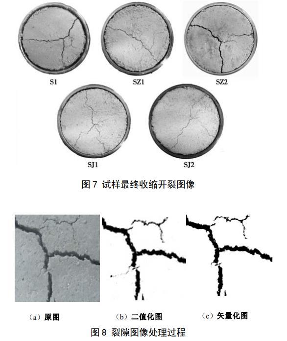 圖7給出了5個(gè)試樣在脫濕結(jié)束后對(duì)應(yīng)的收縮開裂圖像。從圖中可以看出,每個(gè)試樣均出現(xiàn)了不同程度的收縮裂隙,各試樣表面裂隙最終形態(tài)具有大致相似的規(guī)律:3條裂隙相交于一點(diǎn),把圓形表面分成了3個(gè)部分,S1樣和SZ2樣的裂隙較寬,試樣開裂明顯,其余試樣裂隙發(fā)育不明顯,裂隙在形成過程中先形成一條主裂隙,主裂隙發(fā)育過程中支裂隙開始發(fā)育,最終支裂隙和主裂隙相交形成3條裂隙。S1樣和SZ1樣不僅出現(xiàn)了裂隙,在試樣和鋼環(huán)接觸的地方還出現(xiàn)了明顯的分離,試樣出現(xiàn)了體縮,其余試樣也出現(xiàn)了不同程度的體縮,但并不明顯。為得到試樣的裂隙度,先要對(duì)采集到的試驗(yàn)開裂圖片進(jìn)行圖像處理,如圖8所示,先對(duì)采集到的膨脹土干縮過程圖像進(jìn)行二值化,去除一些非裂隙雜點(diǎn),再把二值化圖像進(jìn)行矢量化,矢量化后的圖像通過AUTOCAD提取試樣收縮面積和裂隙面積,最后計(jì)算出試樣的收縮開裂裂隙度: