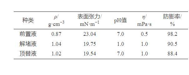 表3為解堵液體系的基本性能評價結(jié)果,可以看出,解堵液體系的黏度值和pH值較低,并且具有較低的表面張力,有利于注入和返排。另外,體系具有良好的防膨效果,能夠防止黏土礦物的水化膨脹。