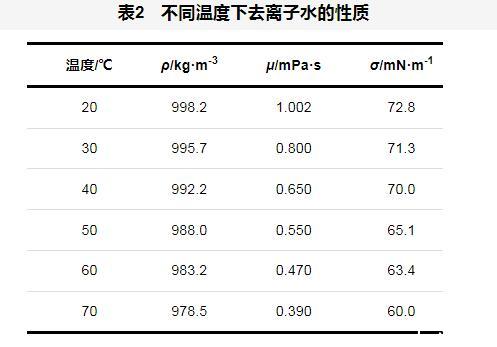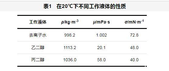 能夠在壁面上完全鋪展的液膜不僅僅與壁面的結(jié)構(gòu)和潤濕性有關(guān),還與液體本身的物性有著密切關(guān)系。較高的黏度會導(dǎo)致液膜在流動過程中變得更加穩(wěn)定且不容易破裂,使得液膜的分布相對均勻;表面張力會改變壁面上液膜的潤濕性,從而影響液膜在壁面上的鋪展能力。因此,深入探討不同物性對液膜分布的影響,具有重要的理論意義和實際應(yīng)用價值。在實驗中工作液體包括去離子水、乙二醇、丙二醇。工作液體的性質(zhì),如表1所示。同時溫度的變化將直接影響液體的黏度和表面張力,隨著溫度的升高液體分子的動能也隨之增強,分子間的相互作用減弱,黏度和表面張力都將減小,進而影響液膜的形成和鋪展,不同溫度下去離子水的性質(zhì),如表2所示。