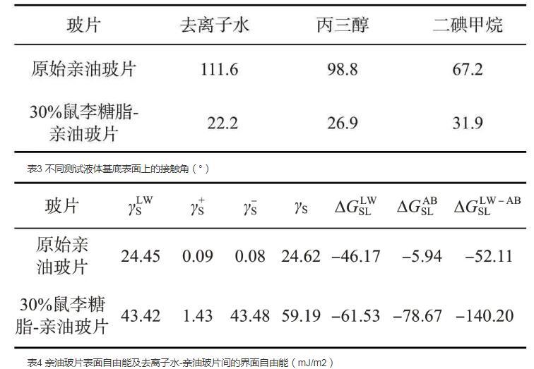 原油開采及運(yùn)移過程中,巖石表面潤濕性對提高采收率十分重要,而巖石表面自由能變化是研究其潤濕性改變的基礎(chǔ),也是其他物質(zhì)與巖石間相互作用的具體體現(xiàn)。本研究主要采用去離子水(Lewis酸堿呈中性)、丙三醇(極性液體)及二碘甲烷(非極性液體)作為檢測液體原始親油玻片及30%鼠李糖脂溶液處理后的親油玻片,計(jì)算固體表面自由能,結(jié)果見表3和表4。由不同測試液體基底表面上的接觸角(表3)可見,無論何種測試液體體系,經(jīng)過30%鼠李糖脂溶液的作用,親油玻片的水濕性顯著提升,尤其是在去離子水中。兩種親油玻片表面的自由能及去離子水-親油玻片間的液-固界面自由能見表4。經(jīng)30%鼠李糖脂溶液處理后,親油玻片表面的水相潤濕角顯著下降,導(dǎo)致原始親油玻片的固體表面能γS僅為24.62 mJ/m2,而30%鼠李糖脂-親油玻片的γS卻達(dá)到59.19 mJ/m2,為原始親油玻片的1.5倍。此外,基于Young公式和DLVO擴(kuò)展理論及式(5)—式(7)分析,兩種條件下的親油玻片與去離子水間總存在吸引力,在原始親油玻片與去離子水間的界面相互作用能中,Lifshitz-van der Waals分量更大,說明其界面間主要依靠van der Waals相互作用;而在30%鼠李糖脂溶液作用后的親油玻片與去離子水間作用能中,Lifshitz-van der Waals作用和Lewis酸堿相互作用均存在,因此30%鼠李糖脂-親油玻片與去離子水間的ΔGLW-ABSL更低。自由能越低說明熱力學(xué)更穩(wěn)定,因此相較于原始親油玻片來說,水更易在鼠李糖脂處理后的親油玻片表面吸附。由此可以推測,鼠李糖脂在界面比原油極性分子展現(xiàn)出更強(qiáng)的競爭吸附能力,可將吸附在巖石表面的原油分子脫附,最終改變儲(chǔ)層潤濕性。