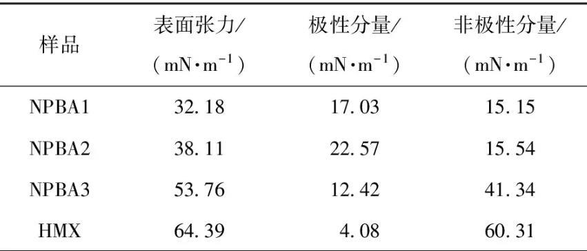 由表5可知,NPBA3與HMX的粘附功最大(113.34 mN/m),且界面張力最小(4.81 mN/m),表明3種NPBA中NPBA3與HMX的浸潤性(粘結(jié)性)最好,且外力破壞粘接界面需做的功(粘結(jié)強(qiáng)度)最大。與NPBA1相比,雖然NPBA2與HMX的粘附功相對較大(分別為75.06 mN/m和78.38 mN/m),但其界面張力相對也大(分別為21.51 mN/m和24.12 mN/m),表明NPBA2與HMX的粘結(jié)強(qiáng)度大于NPBA1,但浸潤性略弱。