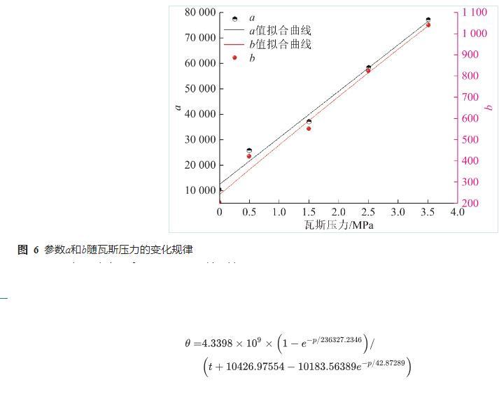 由圖5可知,同一瓦斯壓力下,接觸角隨著時(shí)間的增加而逐漸減小,說(shuō)明水分在含瓦斯煤表面發(fā)生了浸潤(rùn)現(xiàn)象。接觸角θ與時(shí)間t滿足的關(guān)系,參數(shù)a和b的值如圖6所示。參數(shù)a與壓力p滿足的關(guān)系,參數(shù)b與壓力p滿足的關(guān)系。接觸角與壓力及時(shí)間的關(guān)系如式(4)所示。