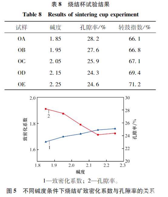 在堿度為1.85~2.25范圍內,燒結試驗表明,致密化系數(shù)與實測孔隙率呈現(xiàn)顯著的負相關關系(F_{Den}越大,孔隙率越?。?。致密化系數(shù)與燒結礦的轉鼓指數(shù)(強度)在堿度1.85~2.15范圍內呈正相關(F_{Den}越大,強度越高)。在堿度提高至2.25時,雖然計算F_{Den}繼續(xù)增大,但實際燒結礦受高堿度下礦相變化(如硅酸二鈣晶型轉變)影響,孔隙率微升,強度微降,表明優(yōu)化堿度在2.15附近為佳。