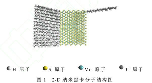 2-D納米黑卡具有雙層結(jié)構(gòu),由大小為30?×40?×12?的二硫化鉬納米片與直鏈烷烴構(gòu)成。假設(shè)理想狀態(tài)下二硫化鉬納米片無晶格缺陷,其活性位點(diǎn)位置確定可參見文獻(xiàn),且全部被C18H38直鏈烷烴接枝,如圖1所示。