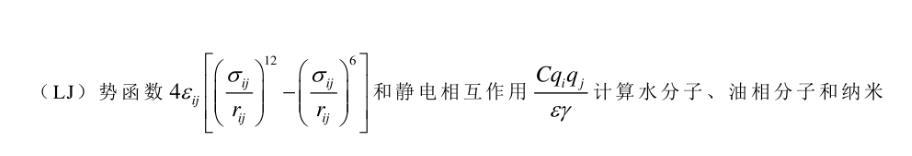 采用SPC/E模型描述水分子間相互作用,該模型中由于H原子質(zhì)量小,對(duì)水分子間的H—H和H—O相互作用可忽略不計(jì)。選取C10H22為油相,原子間的相互作用勢(shì)采用CHARMM勢(shì)函數(shù)來描述。VA8模型在研究二硫化鉬結(jié)構(gòu)和振動(dòng)特性時(shí)具有較高的準(zhǔn)確性,故選取其來描述納米片原子間的相互作用。以直鏈烷烴為改性劑改變納米片的親油親水性,采用CHARMM力場(chǎng)來描述原子間相互作用。采用6/12 Lennard-Jones(LJ)