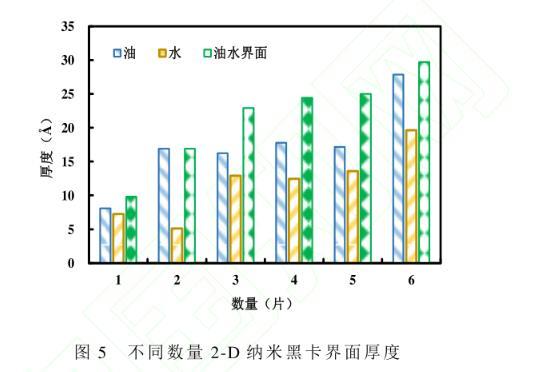 假設(shè)2-D納米黑卡全部平鋪在油水界面,其表面積與油水界面面積的比值即為界面覆蓋率(RIC)。不同數(shù)量的納米黑卡在油水體系中的界面覆蓋率和界面厚度見圖6。界面覆蓋率與界面厚度隨著納米黑卡數(shù)量的增加逐漸增加,且界面覆蓋率呈指數(shù)增加,而界面厚度呈對數(shù)增加,納米黑卡數(shù)量由1增至6時,界面覆蓋率分別為0.16、0.31、0.46、0.91、1.34和2.64。當納米黑卡數(shù)量增加到一定程度時(納米黑卡數(shù)量為4片),油水界面幾乎全部被覆蓋,界面覆蓋率在1左右,此時的界面厚度達到相對穩(wěn)定的狀態(tài),界面呈單層且平鋪吸附狀態(tài);當黑卡數(shù)量繼續(xù)增加,界面覆蓋率指數(shù)增加,界面厚度也隨之增加,此時納米片呈受擠壓狀態(tài),出現(xiàn)褶皺態(tài)和重疊疊加態(tài),繼續(xù)增加納米黑卡數(shù)量,界面達到飽和,界面厚度不再增加,多出的黑卡分散在水溶液中,由于黑卡本身存在弱范德華相互作用,片片間不斷疊加,成為團聚態(tài),從而形成沉淀。該沉淀物質(zhì)以弱范德華相互作用團聚在一起,當遇到剪切、稀釋、振蕩等外界作用時會重新分散在水溶液中,發(fā)揮其單片的作用。