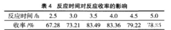 反應時間過短,則反應不完全,過長也無益于反應,因此適當?shù)姆磻獣r間對反應收率也很重要。根據(jù)同類反應的情況,將反應時間選在2.5~5h。在反應體系pH=10~11、n(天冬氨酸)∶n(十四酰氯)=1.1∶1.0、溫度5℃條件下,考察不同反應時間對反應的影響,其結(jié)果如表4所示。由表4可知,反應時間3.5h反應收率達到最佳。