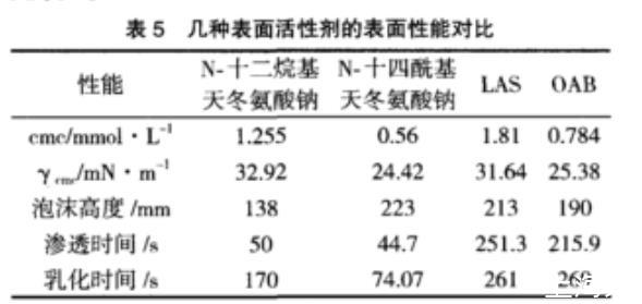 對N-十四酰基天冬氨酸鈉鹽的幾項表面性能進行了測定,并與其他表面活性劑進行了對比,結(jié)果見表5。