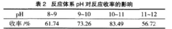 縮合反應需在堿性條件下進行,堿性太弱,不利于反應進行,但堿性太強又會加速酰氯水解,使產(chǎn)品不純,因此必須嚴格控制反應體系的pH。還有一個原因就是當氨基酸的羧基變成鈉鹽后,羧基的化學反應性能即被掩蔽或者說羧基被保護,而氨基的化學反應性能得到加強或說氨基活化,容易和?;Y(jié)合。因此體系的pH選取在8~12。在n(天冬氨酸)∶n(十四酰氯)=1.1∶1.0、反應時間3.5h、反應溫度5℃的條件下,考察不同反應體系pH對反應的影響,其結(jié)果如表2所示。由表2可知,體系在pH為10~11時收率最高。故選擇pH為10~11。