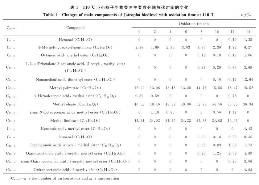 小桐子生物柴油氧化期間GC-MS組成分析結(jié)果見表1。由表1可知,小桐子生物柴油的主要成分是棕櫚酸甲酯、油酸甲酯、亞油酸甲酯,歸一化后的質(zhì)量分?jǐn)?shù)為95.78%。在氧化過程中,含有2個碳碳雙鍵的亞油酸甲酯的含量降低,氧化0h的小桐子生物柴油亞油酸甲酯(C19:2)質(zhì)量分?jǐn)?shù)為42.21%,加速氧化14h,質(zhì)量分?jǐn)?shù)為0,說明亞油酸甲酯幾乎完全氧化,這是因?yàn)槎嗖伙柡椭舅峒柞ケ葐尾伙柡椭舅峒柞ジ菀籽趸?。與單不飽和脂肪酸相比,亞油酸甲酯的碳鏈含有更多的雙烯丙基位點(diǎn),雙烯丙基質(zhì)子對氧自由基的攻擊敏感,導(dǎo)致分子發(fā)生氧化,從而形成過氧化合物,過氧化合物進(jìn)一步氧化轉(zhuǎn)化成醛、酮等化合物。