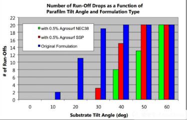 原始配方中超過一半以上的液滴在20°的傾斜角滾落,40°時,全部液滴滾落。Agrosurf NEC38比Agrosurf SSP更有效,可防止所有液滴在30°時滾落,避免60%的液滴在40°滾落??蛻艨筛鶕?jù)這種方法,尋找更加優(yōu)異的表面活性劑。