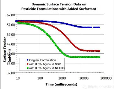 我們分別用Kibron動態(tài)表面張力儀,DSA100液滴形狀分析儀,從動態(tài)表面張力,接觸角和滾動角的角度,來全面衡量和評價(jià)0.5wt%的Agrosurf SSP、0.5wt%的Agrosurf NEC38對農(nóng)藥的噴灑效果。