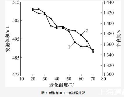 將起泡劑溶液在一定溫度下老化一定時(shí)間后,測試其發(fā)泡體積和泡沫半衰期的變化以評(píng)價(jià)其抗溫性能。稱取0.2 g起泡劑ULT-1于攪拌杯中,加入100 mL蒸餾水,置于攪拌器之上,以轉(zhuǎn)速11 000 r/min攪拌1 min。裝入老化罐,放入滾子加熱爐,在一定溫度下滾動(dòng)16 h,取出冷卻至室溫,以轉(zhuǎn)速11 000 r/min攪拌1 min,測量發(fā)泡體積和半衰期。通過改變老化溫度測量起泡性能與老化溫度的關(guān)系,結(jié)果如圖9所示。從圖9可知:0.2%的新型起泡劑溶液在一定溫度范圍內(nèi)(20~70℃),隨著老化溫度的升高起泡性能基本不變,表明研制的新型起泡劑ULT-1具有較好的抗溫性能。