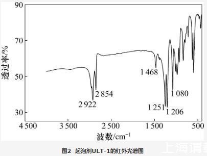 2)利用紅外光譜、質(zhì)譜進(jìn)行新型起泡劑ULT-1分子結(jié)構(gòu)表征,起泡劑ULT-1分子中具有硫酸酯鍵、醚鍵、碳?xì)滏I等官能團(tuán),與分子結(jié)構(gòu)設(shè)計(jì)一致。