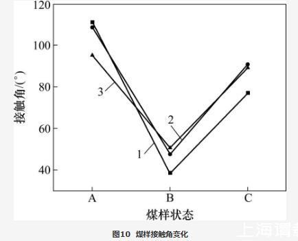 煤樣潤濕性變化主要反映了起泡劑在煤樣表面的吸附與脫附情況,可以根據(jù)接觸角θ判斷潤濕性情況。通常把θ=90°作為是否潤濕的界限,θ>90°表明不潤濕,θ<90°表明潤濕,θ越小,潤濕性能越好。分別取滇東黔西地區(qū)的松河15號(hào)煤樣、恩洪16號(hào)煤樣和天井8號(hào)煤樣,利用接觸角/表面張力測量儀通過五點(diǎn)擬合法分別測量純水在原始煤樣(A狀態(tài))、0.2%起泡劑ULT-1溶液浸泡1 h烘干的煤樣(B狀態(tài))、0.2%起泡劑ULT-1溶液浸泡1 h后低速水流沖洗1 h烘干的煤樣(C狀態(tài))表面的接觸角,結(jié)果如圖10所示。將C狀態(tài)接觸角與B狀態(tài)接觸角的差值定義為接觸角增加值,C狀態(tài)接觸角與A狀態(tài)接觸角的比值定義為潤濕性恢復(fù)值,間接反映了新型起泡劑ULT-1在煤樣表面的脫附程度,潤濕性恢復(fù)值越大,越易脫附,脫附程度越大。原始煤樣接觸角均大于90°,為水不潤濕(A狀態(tài)),起泡劑ULT-1在煤樣表面吸附后接觸角均小于90°,將煤樣表面變?yōu)橹卸葷櫇?B狀態(tài)),但是低速水流沖洗吸附了起泡劑ULT-1的煤樣1 h后,接觸角均明顯增大,松河15號(hào)與天井8號(hào)煤樣的接觸角增加38°以上,接近90°,變?yōu)槿鯘櫇?C狀態(tài)),恩洪16號(hào)煤樣的接觸角增加43°以上,超過90°,變?yōu)椴粷櫇?C狀態(tài))。各煤樣潤濕性恢復(fù)值均超過69%,天井8號(hào)潤濕性恢復(fù)值最高達(dá)到93.70%,表明新型起泡劑ULT-1在煤層氣排液開采過程中易于脫附,有利于儲(chǔ)層保護(hù)。