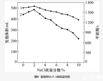 利用抗NaCl污染的能力評(píng)價(jià)質(zhì)量分?jǐn)?shù)為0.2%起泡劑ULT-1水溶液的抗鹽性能。在室溫下,稱取0.2 g起泡劑ULT-1于攪拌杯中,加入100 mL蒸餾水,置于攪拌器之上,以轉(zhuǎn)速11 000 r/min攪拌1 min。直接加入一定量的NaCl,以轉(zhuǎn)速11 000 r/min攪拌1 min,測量發(fā)泡體積和半衰期。通過改變NaCl的質(zhì)量分?jǐn)?shù)測量起泡性能,結(jié)果如圖8所示。從圖8可知:當(dāng)NaCl質(zhì)量分?jǐn)?shù)在2%以內(nèi)時(shí),發(fā)泡體積和半衰期緩慢增大,當(dāng)NaCl質(zhì)量分?jǐn)?shù)繼續(xù)增大時(shí),發(fā)泡體積和半衰期緩慢降低;當(dāng)NaCl質(zhì)量分?jǐn)?shù)達(dá)10%時(shí),發(fā)泡體積和半衰期仍能保持較高水平,表明研制的新型起泡劑ULT-1具有較好的抗鹽性能。