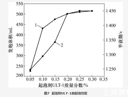 當(dāng)起泡條件相同時(shí),起泡劑水溶液的表面張力越低,發(fā)泡體積越高。配制一系列濃度梯度的起泡劑ULT-1水溶液,利用接觸角/表面張力測量儀采用懸滴法測量表面張力與起泡劑ULT-1質(zhì)量分?jǐn)?shù)的關(guān)系,結(jié)果如圖6所示。從圖6可知:當(dāng)起泡劑ULT-1質(zhì)量分?jǐn)?shù)小于0.05%時(shí),表面張力隨起泡劑ULT-1質(zhì)量分?jǐn)?shù)的提高快速降低;當(dāng)起泡劑ULT-1質(zhì)量分?jǐn)?shù)大于0.05%時(shí),表面張力降幅越來越?。划?dāng)起泡劑ULT-1質(zhì)量分?jǐn)?shù)提高至0.2%時(shí),表面張力降至20.40 mN/m,較蒸餾水降低了71.82%,繼續(xù)提高起泡劑ULT-1的質(zhì)量分?jǐn)?shù),表面張力不再降低。表明新型起泡劑ULT-1在較低濃度時(shí)即達(dá)到較低的表面張力,有利于提高發(fā)泡體積。
